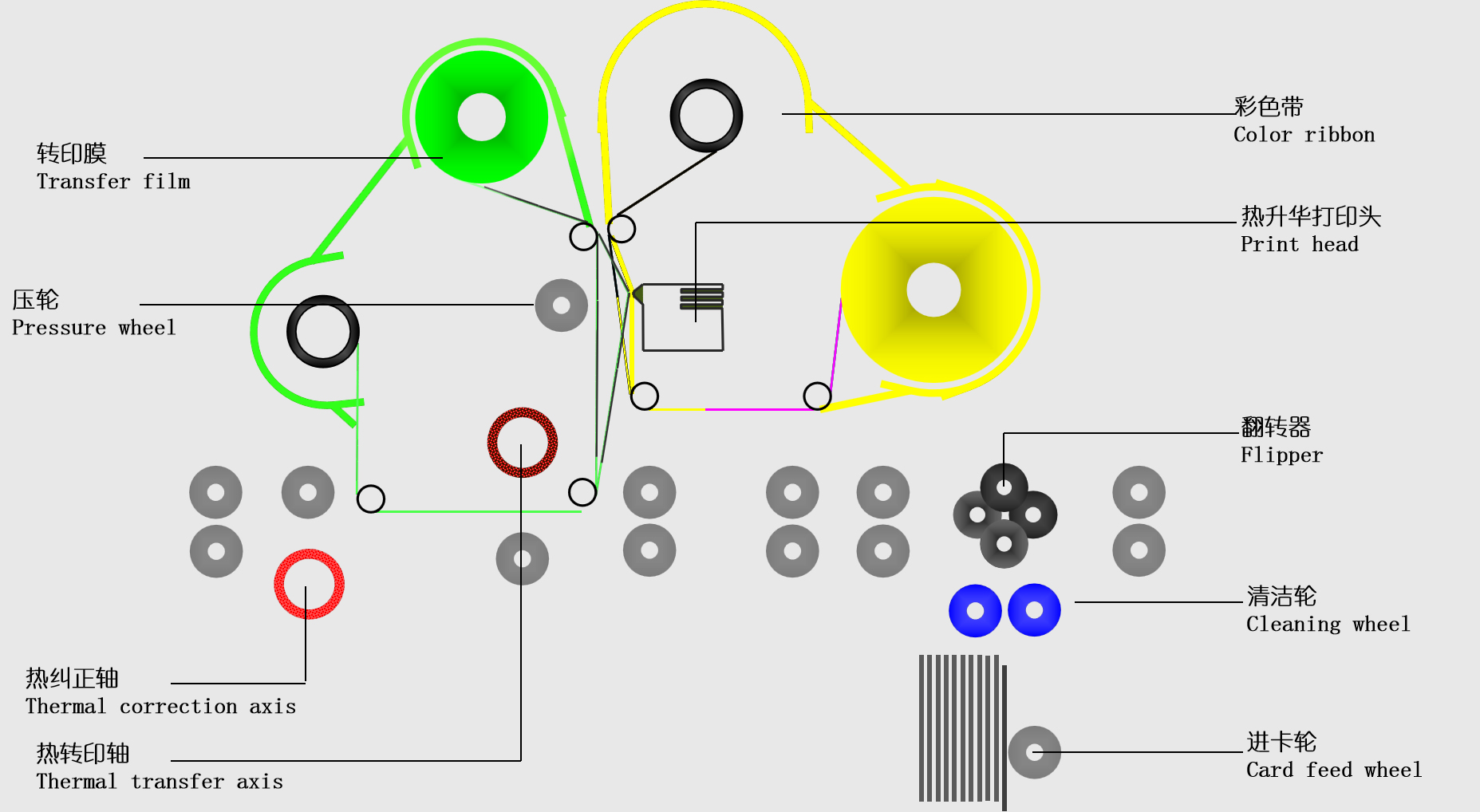 There are two ways to realize the printing of plastic cards: Re-transfer to the card and Direct to the card. The main difference is that the former print head does not contact with the card surface, i.e, printing firstly the image to the Print Film, secondly re-transferring to the card surface, while the latter print head prints directly to the card surface. The technology used is Heat-sublimation or in other words so-called “Dye-sublimation/Resin-Sublimation”. Whichever they are, all use heat to transit the resin to the print media by attempering the semiconductor heater elements to control color ratio and intensity.